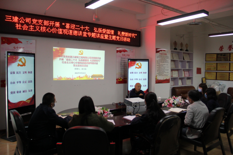 (省三建公司 讯 韩毓、王文杰/文 韩毓/摄 )2022年是党的二十大召开之年,是落实省第十四次党代会精神开局之年。为持续巩固拓展党史学习教育成果,加强精神文明建设,深化民族团结进步宣传教育和感恩教育,讲好各族民族守望相助、团结奋进的国企故事,积极培育和践行社会主义核心价值观,9月21日,公司党支部开展“喜迎二十大 弘扬爱国情 礼赞新时代”社会主义核心价值观道德讲堂专题讲座暨主题党日活动。